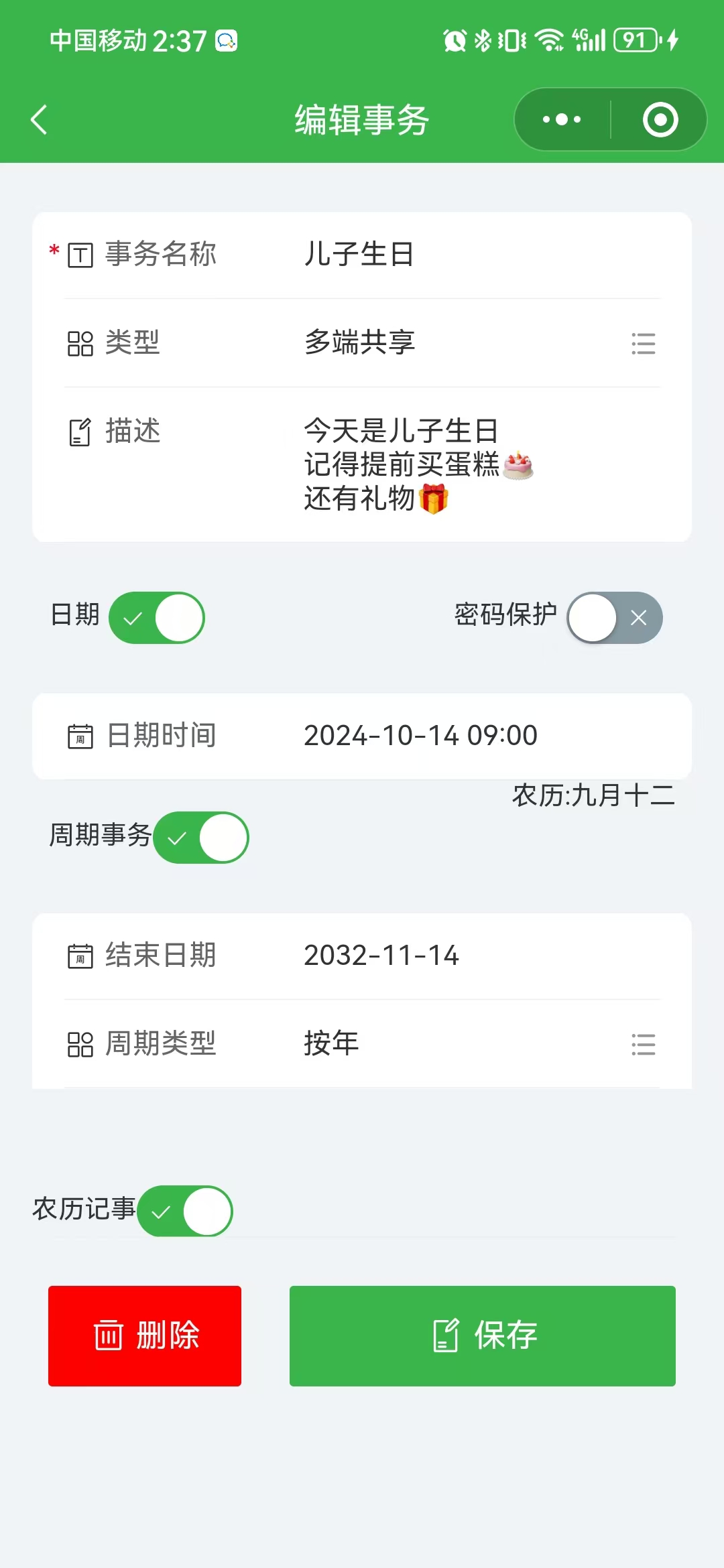 绿色、免费的日历形式的记事软件,特色功能:待办事务、周期事务、日记、待办清单、多种皮肤样式、自定义样式、多端同步等
